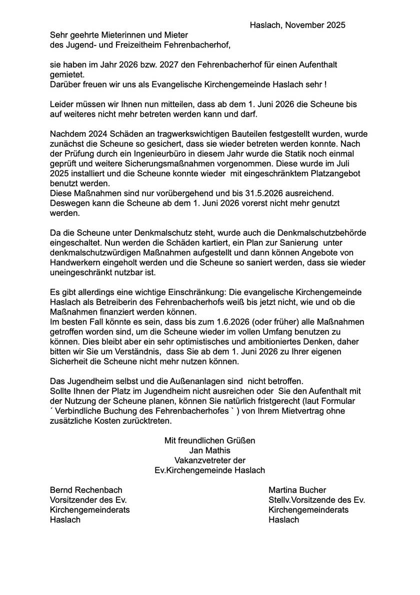 Buchungen: Evangelisches Pfarramt Haslach, Mühlenstraße 6, 77716 Haslach im Kinzigtal,